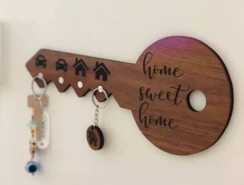 Nuestros portallaves están cortados y grabados con láser en madera natural. Diseños con formas bonitas, frases, nombres de familia o el clásico “Home Sweet Home”.
